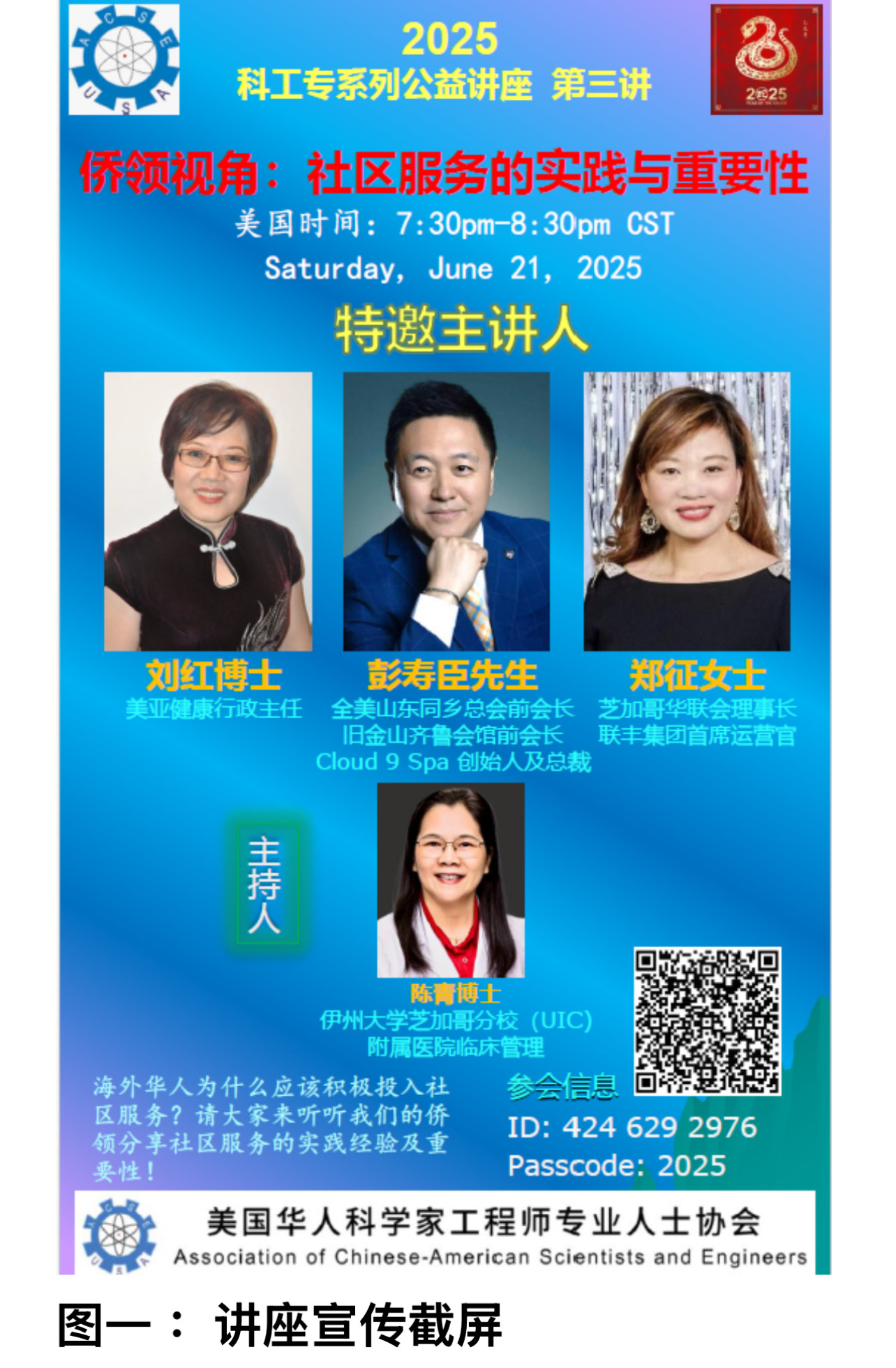 (芝加哥時報快訊)(供稿:科工专讲座团队:吕涛博士)海外华人为什么应该积极投入社区服务?美国时间2025年6月21日晚, “美国华人科学家工程师专业人士协会” (简称:科工专, The Association of Chinese-American Scientists and Engineers, ACSE)成功主办了举办了公益讲座- “侨领视角:社区服务的实践与重要性”。当晚的主持人是陈青博士。嘉宾是(海报以及发言次序按照嘉宾英文字母顺序排列)刘红博士,彭寿臣先生, 以及郑征女士。
